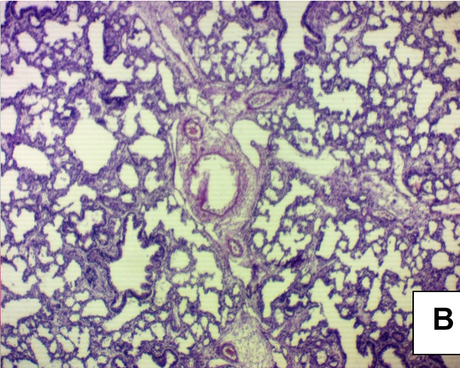 En [B] anatomía microscópica, alvéolos poco aireados, bronquiolos normales, vasos normales.