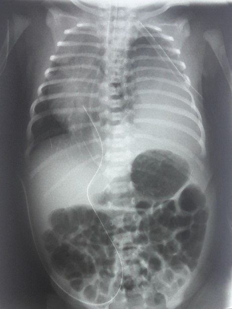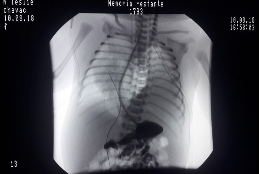 La paciente permaneció con baja saturación de oxígeno a pesar del soporte ventilatorio, se realizó un ecocardiograma que evidenció un corazón normal desplazado hacia la derecha, con hipertensión pulmonar leve, y lo que parecía ser una masa al lado del corazón. Sospechando de una hernia diafragmática congénita, se llevó a cabo una fluoroscopia que mostró que el estómago estaba en posición normal, mientras que el esófago y la vena cava inferior estaban desplazados hacia la derecha.