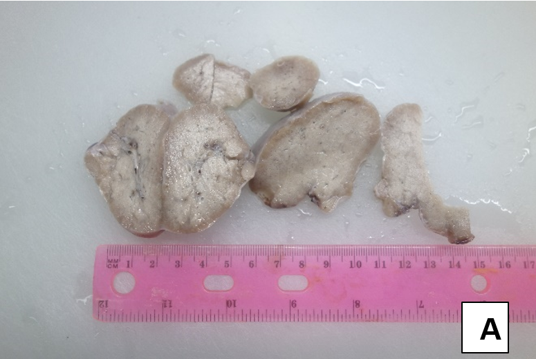 En [A] anatomía macroscópica, masa sólida con algunos bronquiolos.