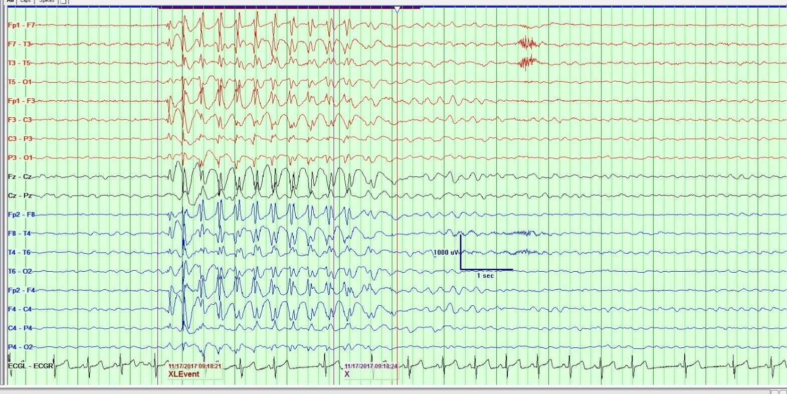 Se realizó EEG con privación de sueño, dónde se mostraban descargas generalizadas de complejos de punta onda a 3 ciclos por segundo que aparecían durante la estimulación luminosa intermitente, durante la hiperventilación, y en vigilia de hasta 7 segundos de duración (Ver figura 1). Durante las descargas se evidenciaba desconexión del medio con mirada fija y, en alguna ocasión, automatismos orales.
