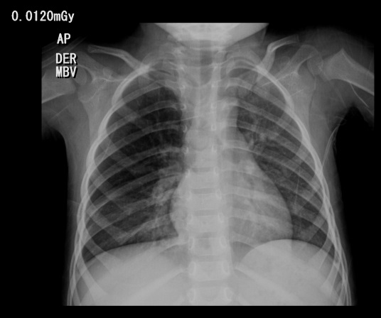 A su ingreso se administra oxígeno por cánula y se solicita radiografía de tórax reportada dentro de parámetros normales. Se considera diagnóstico de episodio sibilante y se inicia manejo con broncodilatador y oxígeno. La evolución clínica es desfavorable, con persistencia de picos febriles e incremento de trabajo respiratorio, por lo cual se realiza radiografía de tórax control 3 días después que muestra neumonía multilobar (Ver imagen 1). Adicionalmente se realizan hemocultivos y se inicia cubrimiento antimicrobiano con ampicilina sulbactam. Se inicia también tratamiento con oxígeno por cánula, salbutamol y beclometasona en inhaladores. Fue valorado por el servicio de infectología pediátrica, quienes consideraron continuar cubrimiento antimicrobiano y seguimiento de hemocultivos, los cuales finalmente resultan negativos.
