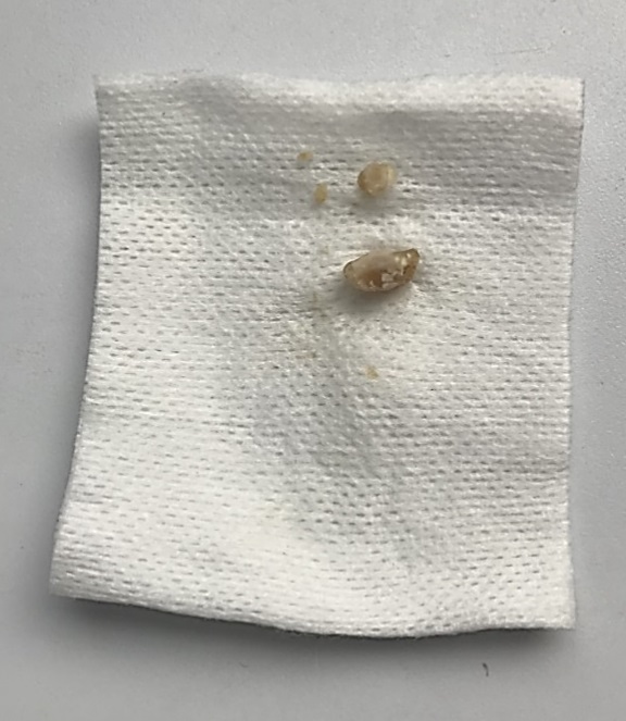 Cuerpo extraño extraído (maní) de aproximadamente 0.8 cm de largo.