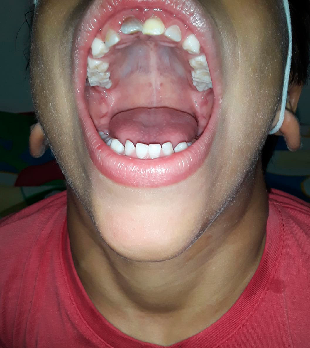 Al examen físico se evidenció, dolicocefalia, frente abombada, fisuras estrechas, columna hipoplásica, narinas apuntando hacia arriba, paladar íntegro, pabellones rotados posteriormente, a la exploración intraoral caries dentales, desgaste oclusal en dentición decidua, mordida abierta anterior y paladar con tendencia ojival (Ver foto 1 y 2), cuello eutrófico, cifosis lumbar, tórax corto, cardiopulmonar normal, abdomen globoso, no masas, hipertrofia de muslo y pie plano bilateral (Ver foto 3).