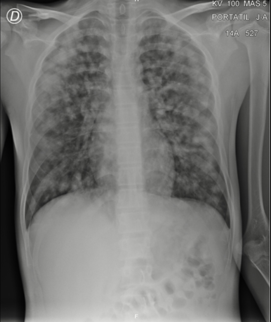 Dado el cuadro respiratorio agudo y signos de dificultad respiratoria, se decidió iniciar manejo con oxígeno suplementario a bajo flujo con una fracción inspirada de oxigena aproximada del 24 %, los gases arteriales presentaron: pH =7.46; pCO2 = 26.4 mm Hg, PO2 = 53 mm Hg, HCO3 19.1 mEq/l; base exceso (BE) = -5 mEq/L, lactato en 1.72 mmol/L, con relación entre la presión arterial de oxígeno y la fracción inspirada de oxígeno (PAFI) de 220. Teniendo en cuenta la altura a la que se encuentra el municipio de Chiquinquirá se consideró una hipoxemia no respondiente a terapéutica, con trastorno de la oxigenación leve asociada a trastorno ácido base tipo alcalemia respiratoria con hiperlactatemia. El gradiente alveolo capilar se encontraba aumentado para lo esperado. En la radiografía de tórax de ingreso se evidenciaron múltiples infiltrados generalizados con opacidades algodonosas diseminadas en ambos campos pulmonares sugestivas de edema pulmonar (Ver figura 1). No se encontraron signos de derrame pleural ni de patologías asociadas.