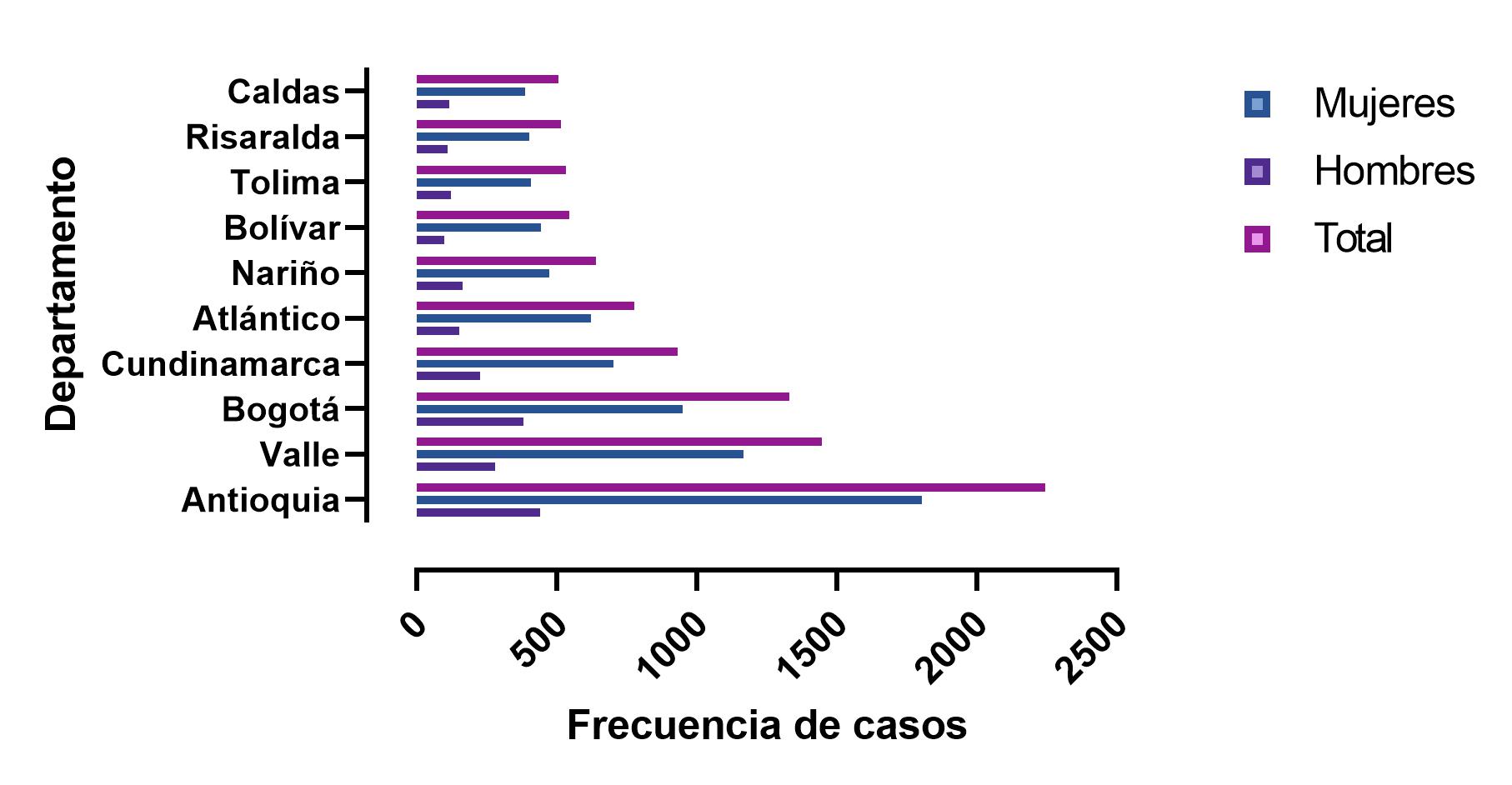 Estos resultados también permiten identificar las regiones del país en las cuales se reportan mayores casos, como son los grandes centros poblados de Antioquia y Bogotá D.C., además de ciudades intermedias ubicadas en Bolívar, Tolima, Risaralda y Caldas. Se destaca que regiones alejadas y con importante población rural dispensa presentan menos reportes, por lo cual sería necesario profundizar en las causas que explican este comportamiento.