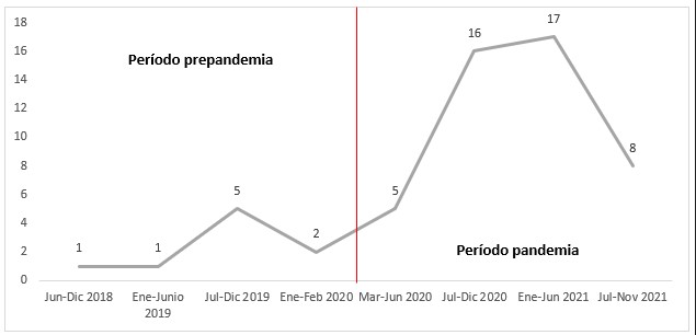 Durante el periodo pandemia se identificaron 46 casos de intento suicida. La figura 1 muestra la distribución de casos en los años 2018 - 2021 (Ver figura 1).
