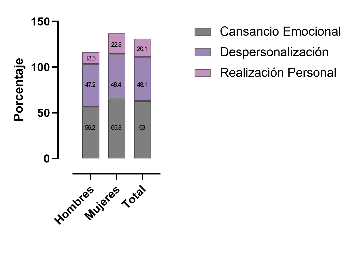 Dentro de las dimensiones del síndrome de burnout o agotamiento profesional, el 63 % de los encuestados presenta positividad de alto cansancio emocional, siendo mayor en mujeres 65.8% vs hombres 56.2 %. Así mismo, en la despersonalización entendida como desprendimiento y desconexión emocional con el entorno, generando la práctica profesional de forma sistemática y con pobre empatía, se evidencia que es mayor en las mujeres 48.4% vs los hombres 47.2 %. Al analizar la realización personal frente a su trabajo, entendida como la satisfacción por el rol profesional, se evidencia que el 22.8 % de las mujeres tienen una media o baja realización personal a diferencia del 13.5 % de los hombres.