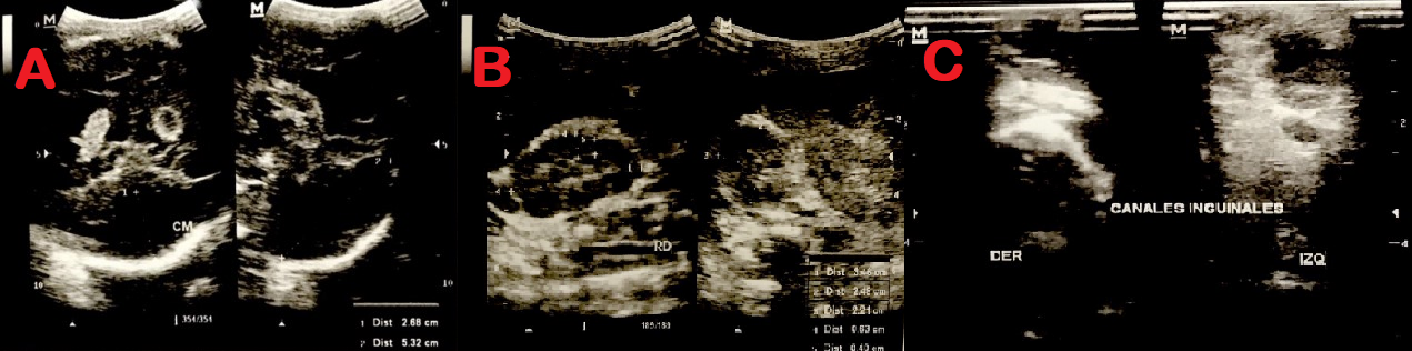 A: presencia de quistes en la ecografía transfontanelar. B: ecografía renal pérdida de la relación cortico medular C: ecografía inguinal no es posible detectar testículos.