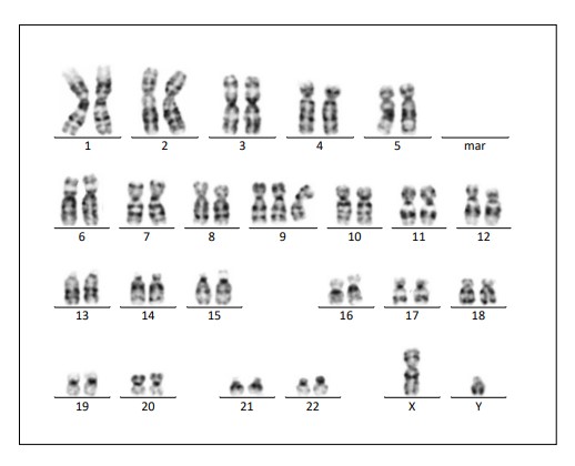 Se realiza estudio genético que reporta que el análisis citogenético mostró un cariotipo bandeo G, 47,XY,+9 (Ver figura 4) en todas las metafases analizadas. Se recomendó asesoramiento y valoración por genética clínica.