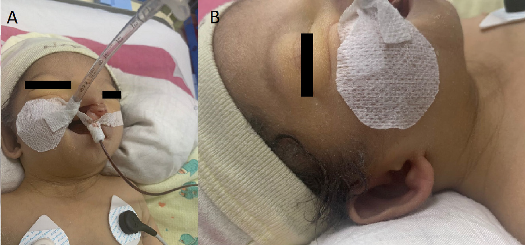 A los 5 minutos de vida presenta dificultad respiratoria con puntaje de Downes de 3 dado por quejido audible a distancia, taquipnea y múltiples malformaciones por lo que es trasladado con oxígeno por Neo-Tee® a 8 litros, a la unidad de cuidados intensivos neonatales, posterior a ello aumenta su dificultad respiratoria presentando puntaje de Downes de 6 por lo que amerita intubación endotraqueal.