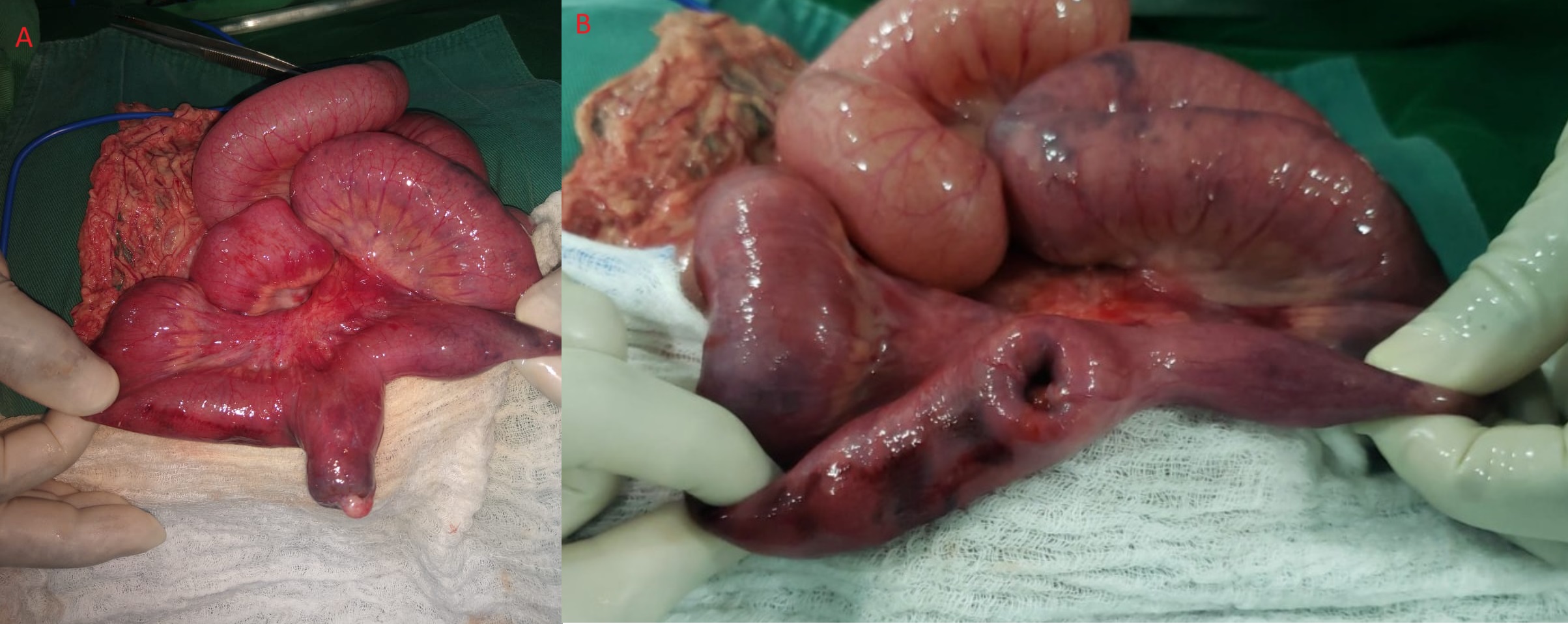 Se aprecia en a, la invaginación intestinal ileocecal secundaria a divertículo de Meckel, en b se aprecian signos de isquemia y marcado edema, con dilatación de asa proximal.