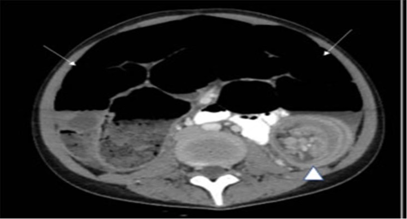A la exploración física con estabilidad hemodinámica y respiratorio, a nivel abdominal con marcado dolor a la palpación en hemiabdomen derecho, sin datos de irritación peritoneal. Se enfoca inicialmente con un dolor abdominal agudo a estudio, se realizan estudios de extensión hemograma con leve leucocitosis con neutrofilia, proteína C reactiva no en rango de bacteriemia, ecografía de abdomen con hallazgos inespecíficos de proceso inflamatorio en yeyuno proximal con liquido libre en cavidad abdominal.