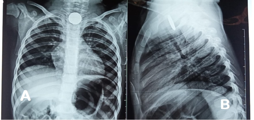 Figura 1. A: Presencia de pila de botón en tercio superior de esófago en radiografía anteroposterior de tórax. B: Presencia de pila de botón en tercio superior de esófago en radiografía lateral de tórax.
