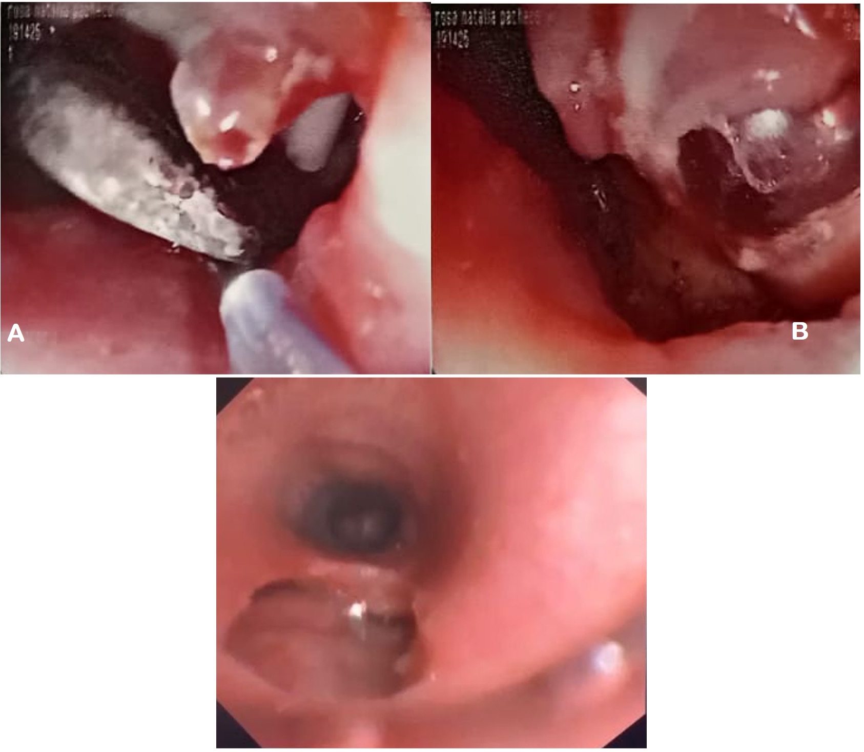 A su llegada a nuestra unidad hospitalaria, se recibe paciente hemodinámicamente estable, con sialorrea moderada y facies dolorosa, por lo cual, se inicia plan de hidratación y analgesia. Se valora por el servicio de gastroenterología, neumología y cirugía pediátrica y se decide realizar una exploración para normar conducta. Se realiza broncoscopía, la cual reporta pérdida de la continuidad de la mucosa con un diámetro de 20 mm, sin datos de sangrado activo ni de cambios morfológicos de vía aérea (Ver figura 2C). A su vez, se realiza endoscopía que corrobora la misma información, además de estenosis de 20 % aproximadamente.