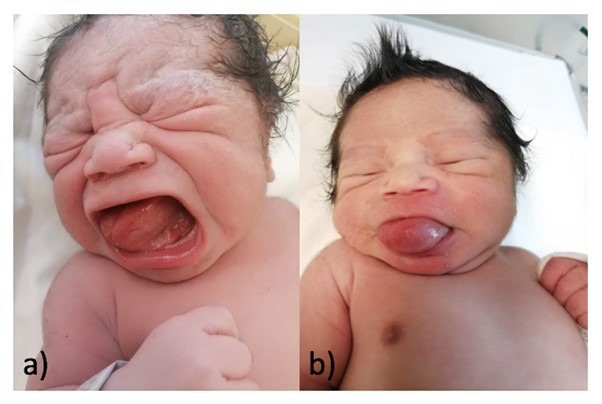 En a) Imagen del paciente al nacimiento, en b) Imagen del paciente a las 6 horas de vida.