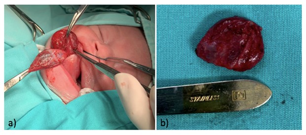 Recién nacido masculino, producto de la cuarta gesta de madre de 32 años, aparentemente sana y con adecuado control prenatal y diagnóstico de hipertensión arterial en la semana 14. En ultrasonido de segundo trimestre se reportó quiste en cavidad oral por lo que se programó cesárea a las 38 semanas de gestación, llora y respira al nacer con Apgar 9-9, sin dificultad respiratoria, peso de 3 660 gr, talla de 52 cm y perímetro cefálico de 35 cm. Durante el transoperatorio se realiza punción y aspiración de 20 cm2 del quiste y se ingresa para abordaje (Ver imagen 1).