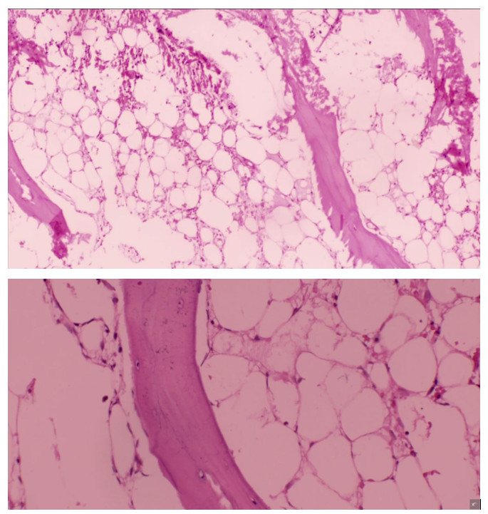 Figura 1. Hipocelularidad del 20-30 % con áreas extensas de reemplazo graso sin cambios displásicos.