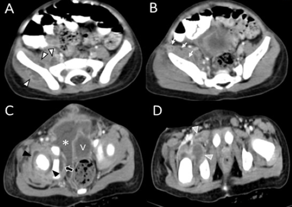 Figura 2. Tomografía de abdomen y pelvis con contraste en cortes axiales que demuestra (A) Absceso de músculo psoas, ilíaco y de glúteo medio (puntas de flecha blanca). (B) Aumento de volumen y múltiples abscesos del músculo iliopsoas (flechas blancas). (C) Absceso en músculo obturador interno (flecha negra), colección intrapélvica (asterisco blanco) que desplaza la vejiga lateralmente (V) y líquido periarticular en cadera derecha (puntas de flecha negra). (D) Abscesos en músculos obturador externo y pectíneo (puntas de flecha gris)