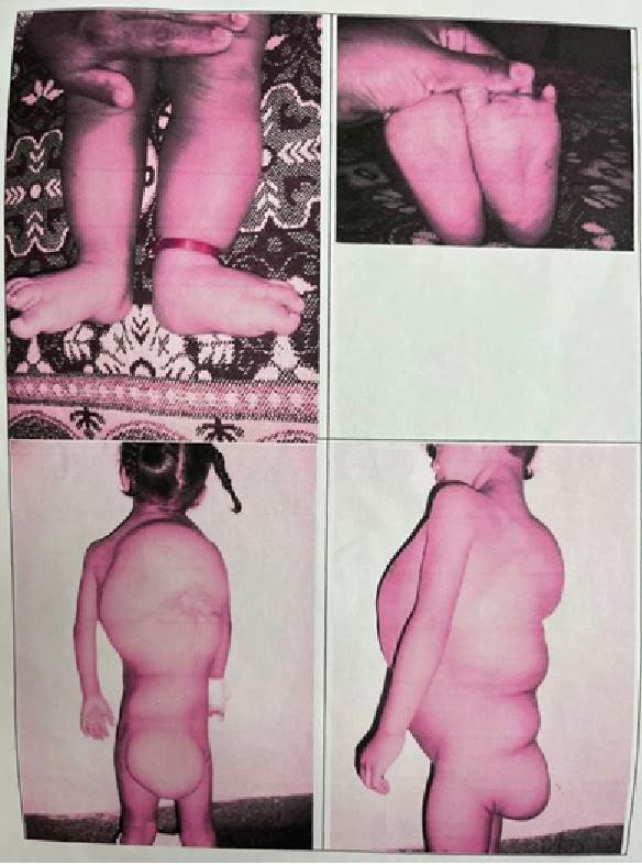 En el examen físico se observa hipercrecimiento, abundante tejido graso, deformidad de tórax bilateral de predominio en hemitórax izquierdo, masa gigante en espalda con cicatriz extensa. Moviliza 4 extremidades, tono muscular normal en miembros superiores, ROT ++ en miembros superiores, con paraparesia e hipotrofia en inferiores. Paciente queda con diagnósticos de Síndrome Cloves (sobrecrecimiento lipomatoso, anomalías vasculares, nevus epidérmico, deformidades esqueléticas), escoliosis sintomática severa la cual fue operada en marzo, mayo y agosto del 2022 y paraplejía secundaria que empeoró.
