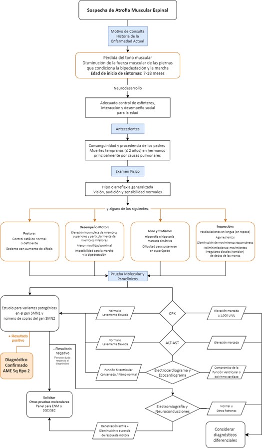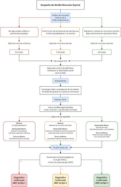 Conclusiones: la metodología Delphi permitió configurar una aproximación algorítmica en forma de flujograma para la identificación temprana de los signos y síntomas y el diagnóstico de cada subtipo de AME 5q. Se propone un sustento integral y pragmático que sirva de orientación para el médico general y especialista, enfatizando en la importancia de su capacitación en la evaluación de signos y síntomas para considerar esta enfermedad tempranamente en el diagnostico diferencial.
