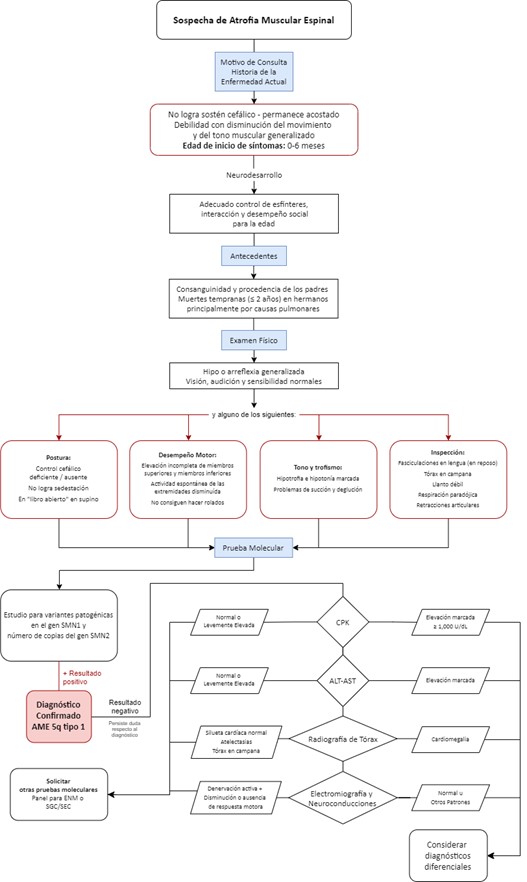 Aunque existen guías terapéuticas para el manejo de AME, existe un vacío en la correlación entre signos y síntomas altamente sugestivos de la enfermedad con la necesidad de la realización temprana de la confirmación genética, especialmente en el contexto de recursos limitados para la atención en salud (10). Por ello, se hace necesario desarrollar un algoritmo que oriente pragmáticamente al personal de salud, con la identificación temprana de los signos y síntomas de AME tipos 1 a 3, con el fin de incrementar el diagnóstico, clínico y molecular, basado en una aproximación clínica sistemática ante la sospecha de AME.